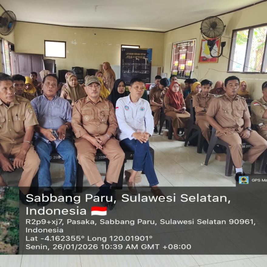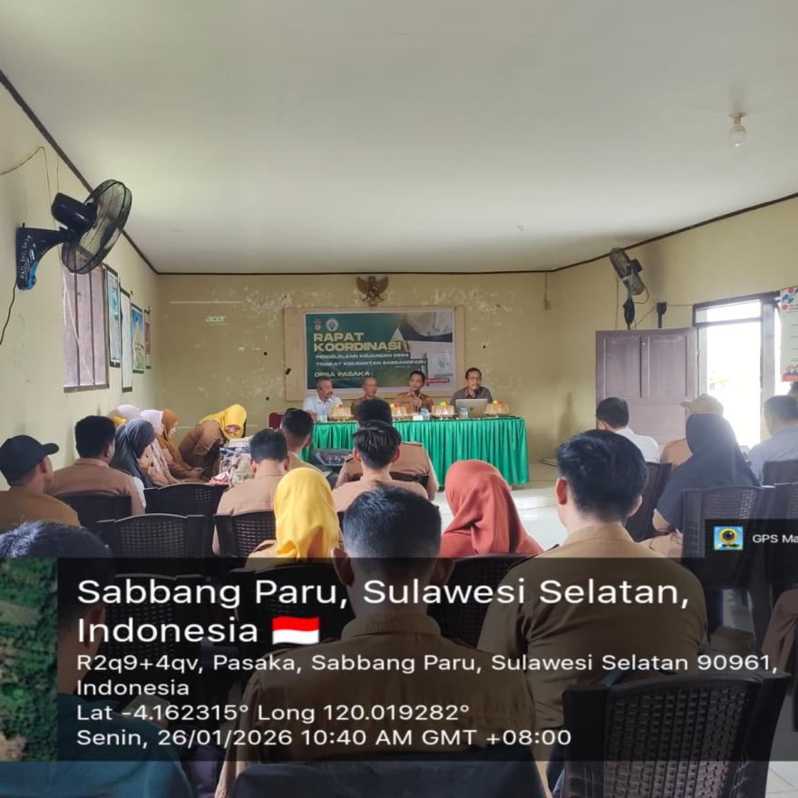 Sabbangparu — Pemerintah Kecamatan Sabbangparu menggelar rapat koordinasi pengelolaan keuangan desa tingkat kecamatan pada Senin, 26 Januari 2026. Kegiatan tersebut berlangsung di Aula Kantor Desa Pasaka dan diikuti oleh para perangkat desa se-Kecamatan Sabbangparu.