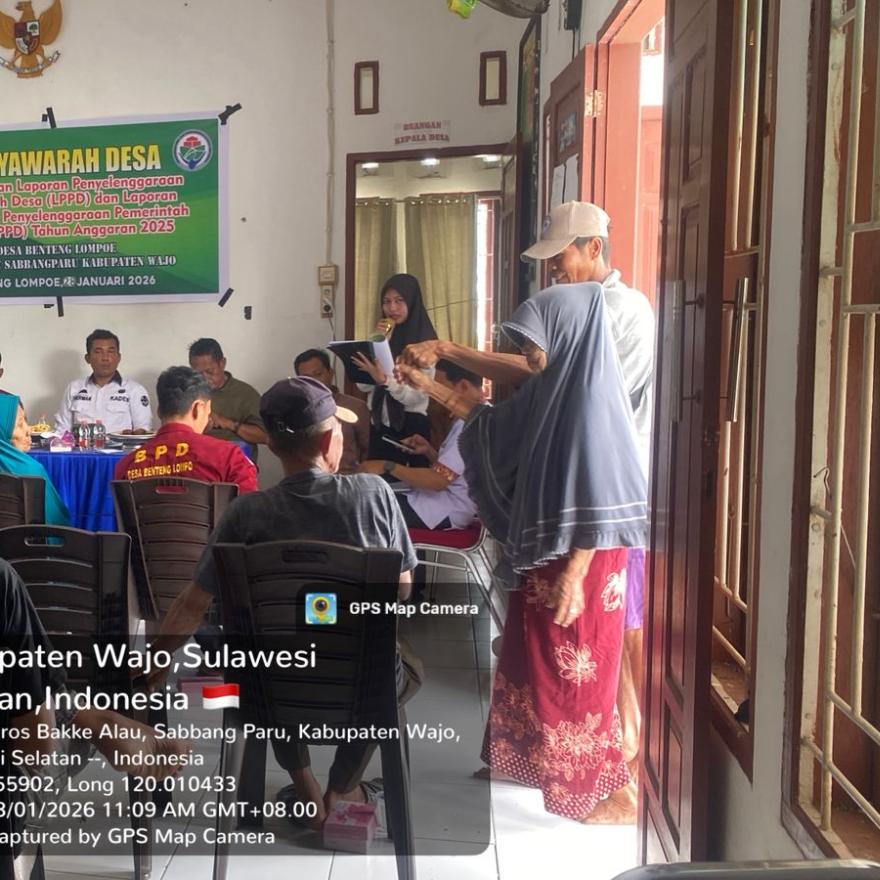 Benteng Lompoe — Pemerintah Desa Benteng Lompoe menggelar Musyawarah Desa (Musdes) dalam rangka penyampaian Laporan Penyelenggaraan Pemerintahan Desa (LPPD) dan Laporan Keterangan Penyelenggaraan Pemerintahan Desa (LKPPD) Tahun Anggaran 2026, pada Rabu, 28 Januari 2026, bertempat di Desa Benteng Lompoe.